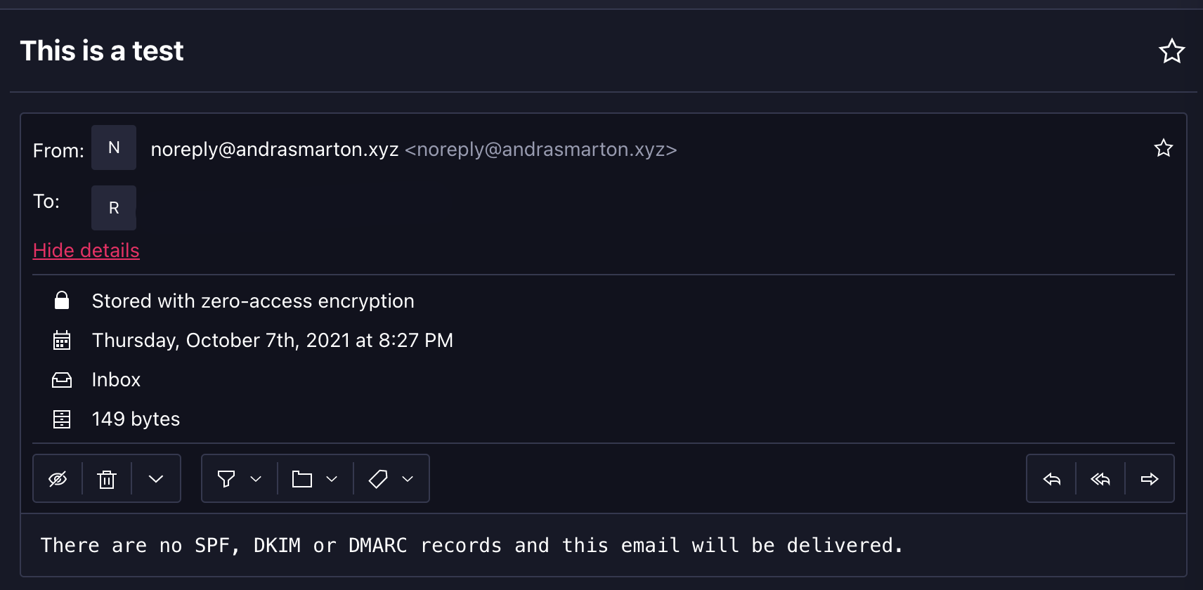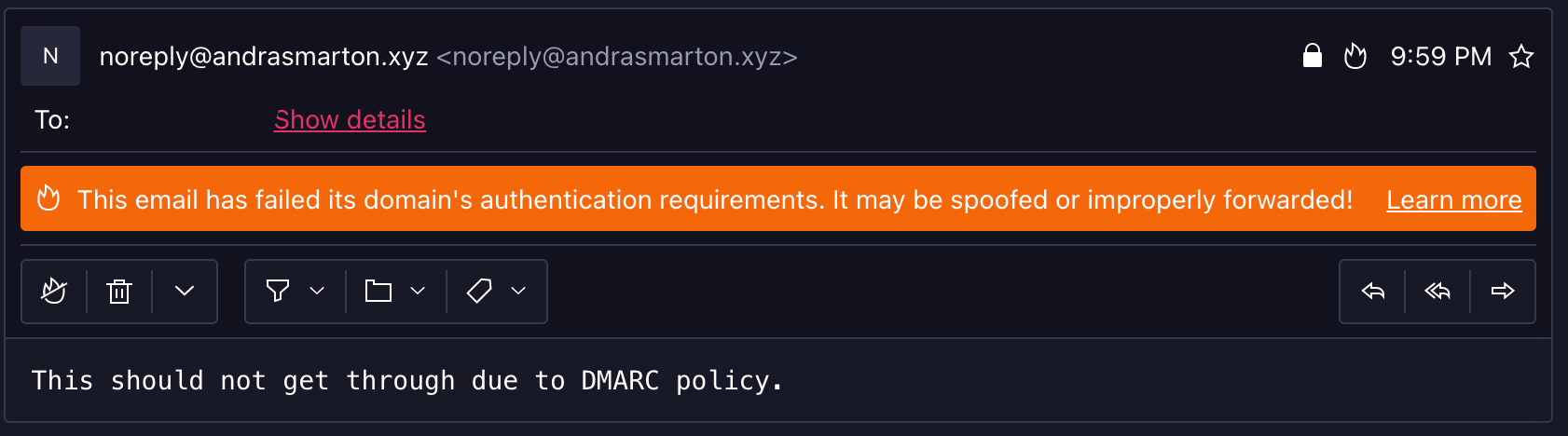 As seen with ProtonMail, while a banner is added and the email is flagged as spam, it still gets through. This is because while the SPF, DKIM records and DMARC policy tell a receiving web server what to do and help authenticate the email, it is still down to the mail server to act on the information it receives.